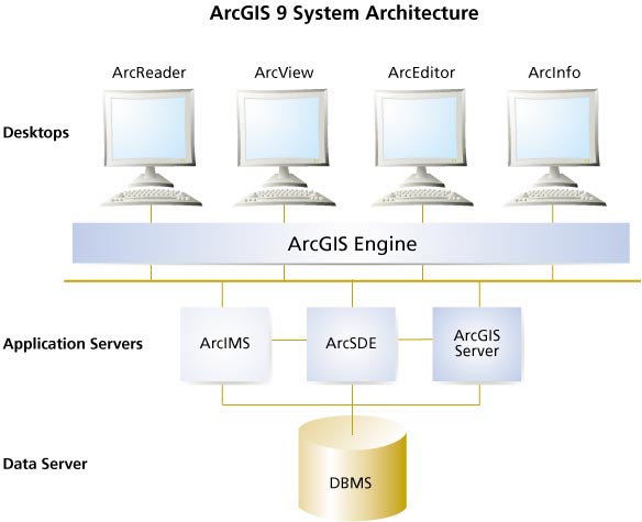 ArcGIS Engine is a developer product for creating and deploying ArcGIS solutions. ArcGIS Engine is built from ArcObjects, the cross platform, C++ component technology framework used to build ArcGIS. With ArcGIS Engine, developers will be able to build solutions and deploy them to customers without requiring the ArcGIS Desktop applications (ArcMap, ArcCatalog) to be present on the same machine. ArcGIS Engine supports all the standard development environments, including .NET, Component Object Model (COM), Java, and C++, and all the major operating systems. In addition, developers will be able to embed some of the functionality available in the ArcGIS extensions. New Server-Centric GIS: ArcGIS ServerThe most significant architectural change to be introduced at ArcGIS 9 is ArcGIS Server. Until ArcGIS 9, advanced GIS functionality has only been available for desktop PCs. Client/Server computing provides shared access to common data in a database, and Internet computing allows data to be published for Web access; however, it has not been possible to build a centrally managed, network-centric, server-based GIS with full GIS capabilities. This is the vision of ArcGIS Server. During the development of ArcGIS 9, Esri has restructured the core ArcGIS platform to be hosted on server computers; to run on all major server platforms; to support all common development environments (.NET, Java, COM, C++); and to include all the powerful mapping, query, analysis, and geoprocessing capabilities currently available in the ArcGIS Desktop products. ArcGIS Server 9 is designed primarily for enterprise information system developers/integrators who wish to build serverside GIS applications in either a client/server or Web services environment. It is complementary to Esri's two other enterprise application servers: ArcSDE, which is used to access spatial data in a commercial database management system (DBMS), and ArcIMS, which is used for high-volume Internet geopublishing. For more information on ArcGIS, visit www.esri.com/arcgis, call Esri at 1-800-447-9778, call your Esri regional office, or contact your local reseller. Outside the United States, please contact your local Esri distributor.