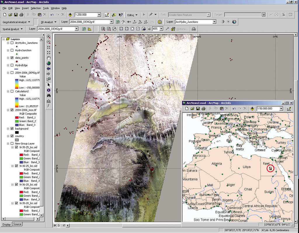 In the time frame between 9,000 and 5,000 years B.C., the Neolithic people in the western desert of Egypt benefited from a humid climatic phase. They were able to survive by hunting, gathering and, later on, by pastoralism. Whereas the present-day climate in this region is hyperarid (in the area of the Dakhla Oasis no measurable rain has been registered over the last 20 years), the precipitation amounts in the early to mid-Holocene humid phase reached maximum rates of approximately 100 mm per year. Outside of the oasis, with its fossil groundwater and the Nile valley, these amounts did not allow widespread land use of the desert. Archaeological and geomorphological investigations evince that only by living in the vicinity of morphological depressions, ephemeral or seasonal water accumulations enabled people to survive. It is obvious that detailed relief data, elevation models, and hydrological parameters are fundamental to finding favorable areas and to reconstruct their land use potential. Due to a lack of topographic maps in these areas, remote sensing data has been used. Advanced Spaceborne Thermal Emission and Reflection Radiometer (ASTER) data from the National Aeronautics and Space Administration (NASA) satellite TERRA, which was launched in December 1999, fulfills the quality and specification required. This data has a ground resolution of 15 meters and allows the production of digital terrain models (DTMs). Because the data is obtained via FTP, a powerful and fast Internet connection is a basic requirement. The rate of transmission from the Earth Observing System Data Gateway via the high-speed university network is up to 4 Mbit/s. As of January 2003, 1,400 scenes, each 120 MB (168 GB total), are available.