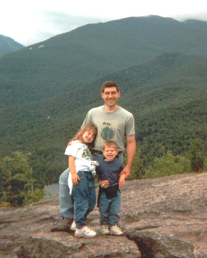 | Eric Herman, GIS program manager, New York State Thruway Authority, is shown here with two hiking buddies (his children Samantha and Alex) atop Mount Jo in the Adirondack Mountains of New York state. Just the perfect place for a GIS Day T-shirt! |