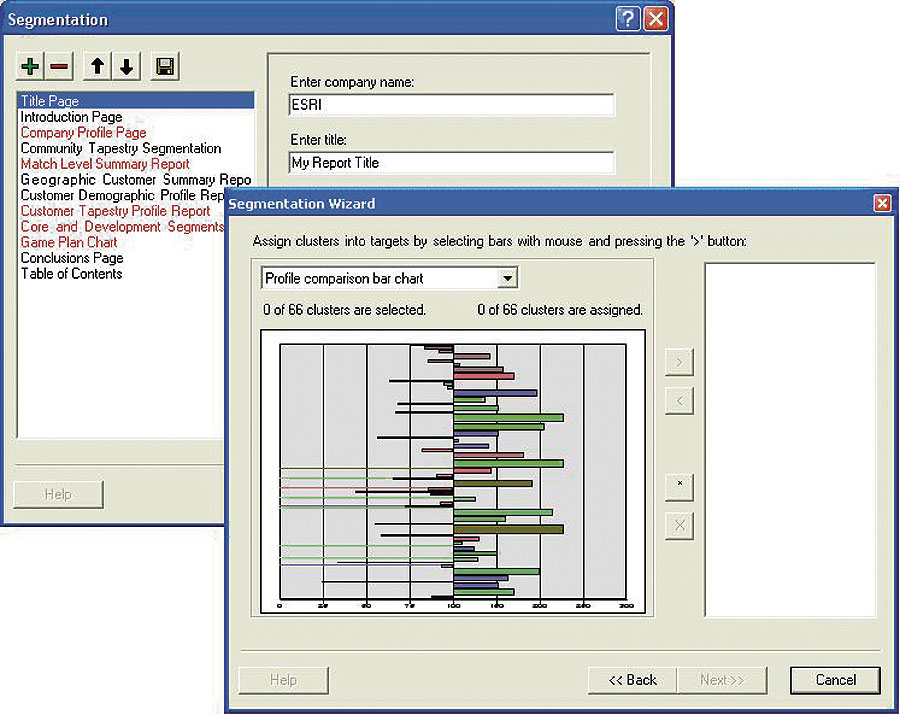 The segmentation module can be used to profile the most profitable customers, identify the best markets, tailor marketing messages to fit the audience, reveal secondary markets, and define product and service preferences. Customer profiles can be compared to other profiles created in the segmentation module. These include trade area profiles, standard geographic area profiles, or profiles based on survey questions from Mediamark Research Inc. After the profile is created, segmentation reports, maps, and charts can be developed with the segmentation module to help identify target groups by Tapestry segment. Users can combine the segmentation analyses with other reports produced in Business Analyst to create a Segmentation Study Book.