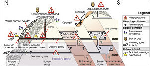 By X. Devleeschouwer, E. Goemaere, and C. Mullard In 2004, the Geological Survey of Belgium (GSB) launched the first Belgian program of computerized management of mines in the municipality of the Commune of Vielsalm (located in the southeastern part of Belgium in the Province of Luxembourg). Associated partners in this program are the Coticule Museum, the Directorate General of Natural Resources and the Environment of the Walloon region, and the University of Li�ge. Located in the southern part of the geological formation known as the Caledonian Stavelot-Venn Massif, the Commune of Vielsalm is built upon rocks of the Salm Group (Ordovician age: 465495 million years old). Rare minerals lie hidden in these metamorphic formations. From the 17th century to the end of the 20th century, Vielsalm was the center of the Belgian mineral extraction industry. Coticule rocks from two deposits were exported across the globe as whetstone (used for honing razors, surgical blades, etc.). The slate deposit is composed of two decametric layers of roofing slate quality, separated by barren slates. The roofing slate and coticule were initially extracted from open pits and later, starting from the middle of the 19th century, from mines. Approximately 30 concessions of roofing slate and coticule were active in the Commune of Vielsalm. The extraction of coticule from trenches evolved into the mines through the excavation of many shallow shafts from which a superimposed system of sinuous galleries followed the layers of coticule. Then, galleries 150 to 450 meters long were dug into the hillside until they reached the roofing slate layers. The maximum depth of a roofing slate mine could reach 60 to 70 meters because of several superimposed, exploited levels. The lower levels are usually flooded today; the dewatered galleries and their exits are practically unknown.