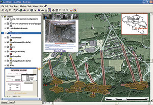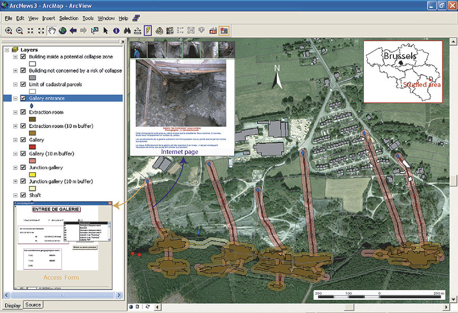 Traditional dwellings and buildings of this area and numerous human traces constitute the last visible signs of this age-old activity. However, this industrial heritage is worthy of interest and deserves greater recognition. Old extraction sites, abandoned without rehabilitation and localized in forest and suburban areas, represent restricted environments for the development of specific fauna and flora. Furthermore, they provide extraordinary mineral sites (to be protected from plundering) and bear witness to the technologies of the past. Special Nature Protection ZonesSome of these environments are already located in special nature protection zones through the European project Natura 2000 and also partly inside nature reserves. The abandoned mines, which are located on private or public land, are often ignored by the population and represent a real danger to people walking, jogging, or cycling close by, as well as to the surface infrastructures and their owners. This historical and scientific heritage must be preserved, restored, and secured. Its management is a priority but remains difficult because of the high number of mines whose exact locations were unknown prior to the beginning of this program. Mining plans, administrative and technical archives, old and recent geographic maps (topographic maps, orthophoto plans, geological maps, etc.), and scientific data are dispersed across numerous locations. Until now, this data was not connected, and the different partners involved in this program wanted to acquire a complete and easy-to-use tool for this purpose. As a result, the GSB team created an application with ArcGIS Desktop (ArcView) software with which all the information and available data gathered could be stored in a database and used and managed within an open, dynamic, and visual GIS. ArcGIS was chosen following a detailed product comparison. Technically, this GIS application is based on the creation of two complementary modules: a relational database management system with Microsoft Access 2000 software for the descriptive data and a cartographic management system with ArcView software for the raster and vector geographic data. The mining plans of Vielsalm, constituting the background documents and starting point of the program, were georeferenced using geographic reference frameworks. This was done through the use of the digital georeferenced and vectorized land register of the Commune of Vielsalm. GPS coordinates were used to enhance precision during the georeferencing procedure of some surface elements represented on the mining plans (shafts, gallery entrances, etc.). The numerous and varied vector layers are associated with the surface and underground extractive industry (galleries, rooms, shafts, waste dumps, etc.), geology (stratigraphic units, structural elements), natural zones (Natura 2000, etc.), land register (parcels, habitations, etc.), and surface infrastructure (roads, castles, etc.).