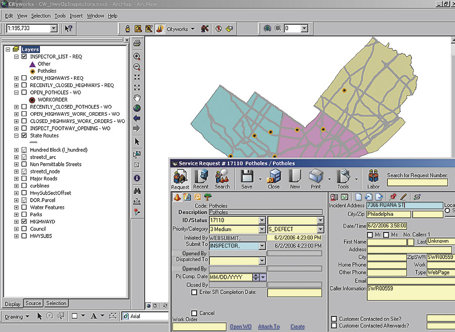 IS&T then moved on to assist Street Lighting, upgrading its system for tracking alley light maintenance. This deployment required the ability to respond to customer calls along with the need to import five years of existing data. This gave the city's implementation team the opportunity to learn about using the system in a more comprehensive process. Meetings were held and workflow diagrams were created to analyze and enhance the business process before the maintenance management system was deployed. The assets used, in this case, are a subset of the GIS pole layer and, using an ArcSDE spatial view of this subset, allow street lighting users access to existing data without any changes to the data structure or maintenance process. Right-of-Way InspectionsThe implementation team next took on the Right-of-Way Unit, which is responsible for the inspection of work performed on city streets. The source of the majority of its work orders is the Streets Department's permit system. This required the development of an import routine, to be run by the supervisor, that reads the Street Closure Permit System database and creates work orders in Cityworks. This was similar to the import routines developed to upload the existing data for alley lights, so the skill set was already available. The process also includes the creation of a digital copy of the permit as an attachment to the work order. Inspections are done using the custom inspection templates in the system. Photos and drawings are stored in an attached spreadsheet created by the inspectors. Smooth StreetsThese first three implementations involved a small number of users, affording an excellent way to learn the system. In the summer of 2005, the Highway Division asked to expand Concrete Operations' system to the full repair process for plumbers' repair ditches and water ditches. This required the addition of five additional standard tasks to the work order types used by Concrete Operations, plus many different alternate tasks to accommodate special situations. It also included nightly synchronization with data from the city's Water Department. The implementation started out slowly, based on limited resources and other priorities. In early 2006, the Mayor's Office announced a new initiative called Smooth Streets. This initiative required the acceleration of street repairs with the goal of repairing potholes the next business day and performing the permanent restoration of ditches within 30 days of their creation. The department realized that meeting and measuring these goals would require a full-scale implementation of the maintenance management system. The implementation team rose to the challenge, adding all Highway Division service request and work order types, special event layers to display data, new reports, and custom ArcView documents for customer affairs representatives and inspectors who would determine the validity of citizen calls. The inspectors were also provided with wireless laptops, and the existing Citrix Secure Gateway was used to allow data entry in the field. This process required the training of nearly 100 users. A Web-based application was also developed to allow citizens to report potholes. This application uses existing ArcIMS software-based Web services, provided by the Mayor's Office of Information Services GIS Services Group, to verify addresses and assign districts. This data is automatically imported into the system as part of the nightly inspection. The resulting implementation has provided Philadelphia's Streets Department with a personalized configuration that delivers exact and immediate results to end users, allowing system expansion and modifications to be quick and easy. More InformationFor more information, contact Marion Storey, IT Applications Program manager, Philadelphia Streets Department (tel.: 215-686-5031, e-mail: marion.storey@phila.gov), or George Mastakas, director of Professional Services, Azteca Systems (e-mail: georgem@azteca.com). |