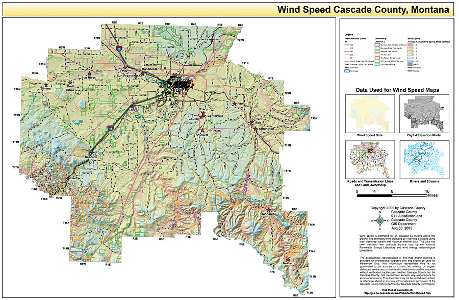 A PDF version of the map book is available on the Cascade County GIS Department Web page at www.co.cascade.mt.us. The Web page also includes links to a Wind Power Map and Wind Speed Map that visitors can download in PDF format. When someone requires more detail about a specific area, Mital creates a custom map. ArcGIS allows the county to show developers wind speeds across the county and locations of transmission lines. "Along with that, we have data such as topography, so it's very easy for someone to see that a wind farm would not be on the top of a pristine mountain," Beltrone notes. "This saves developers from having to fly in and be on the ground to see these things for themselves, and it saves them from having to go to the courthouse to search for landownership documents. Instead, they can access all of this information in one place on a computer anywhere in the world."