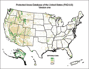 PAD-US, released in April 2009, generally describes protected lands as those lands held in fee or easement ownership for permanent or very long-term open space uses. These include national parks and forests, public lands, wildlife preserves, state and local parks and reserves, wildlife management areas, lands held by nonprofit organizations, and other areas designated as protected. The database, built in an ArcGIS file geodatabase, provides a wealth of attributes, including the name, location, ownership, land management designation, and measures of biodiversity protection, for each parcel in the dataset. GAP has long used ArcGIS to map land cover, land stewardship, and predicted vertebrate species distributions—first on a state-by-state basis and more recently on a regional basis. In addition to providing a comprehensive picture of conservation lands in the United States, GAP has worked with the United Nations Environment Programme World Conservation Monitoring Centre (UNEP-WCMC) to link PAD-US to the World Database on Protected Areas (WDPA). To enable inclusion of PAD-US in the WDPA, International Union for Conservation of Nature classification designations were applied to each parcel in the database. This linkage will facilitate collaboration between conservation organizations by establishing a consistent understanding of protected lands status whether the focus is global or local. "The U.S. data is extremely important to us," says Charles Besan�on, head of Protected Areas Programme, UNEP-WCMC. "Integrating PAD-US and WDPA is a high priority." The UNEP-WCMC Protected Areas Data Unit, which maintains the WDPA, was established in 1981 to compile information on the world's protected areas and to be a resource for those requiring such information. Because it incorporates information from national governments, nongovernmental organizations, academic institutions, international biodiversity convention secretariats, and other organizations in each country into a single dataset, the WDPA is an important resource for the organizations and individuals making decisions about conservation. BackgroundTo create the stewardship layer, GAP aggregates public landownership and internal management boundaries and categorizes protected areas on a scale from 1 to 4 based on their conservation management practices. Prior to 2008, GAP focused on state and regional projects, creating the need for a national protected areas database that CBI initiated, with funding from sources such as the World Wildlife Fund and USGS GAP. CBI and GAP continued to manage data at different scales until it became apparent that a variety of stakeholders was required to provide the sustainable resources needed to meet demand, resulting in the initiation of the PAD-US design process. The PAD-US project is addressing some long-term maintenance issues with protected land inventories. Partners are working to extend aggregations to local (easement parcel, city, county) levels, build capacity for improved/automated state data updates, and increase efficiency through more coordinated federal land inventories. The partnership will facilitate the maintenance of a national dataset by improving the spatial accuracy of inventoried lands and creating a standard for collecting and processing the data. The partnership has developed a uniform coding system that specifically categorizes the protection level for each parcel contained in the database and has developed more complete and descriptive attributions for the data. Finally, protected areas are both uniquely and uniformly identified by name and management designation to facilitate assessments at various scales (regional, continental, and global). The geodatabase was a natural choice for creating and hosting PAD-US, which incorporates disparate data from numerous partners. Using a geodatabase made the integration of more than 800,000 records from hundreds of different organizations feasible. "It was challenging to design a user-friendly and accurate parcel identification system," says Lisa Audin, GAP stewardship coordinator. "Data sources provided an incredible variety of landownership and management designation descriptions, complete with spelling errors and various acronym combinations." The use of coded domains in the PAD-US geodatabase was pivotal to standardizing a parcel's class (federal, tribal, state, private, etc.), land manager (U.S. Forest Service, State Fish and Game, TNC, etc.), and management designation (wild and scenic river, wilderness area, national wildlife refuge) in a national context. The complex nature of protected land data required a robust, yet flexible, geospatial database structure. The PAD-US technical team determined that Esri's geodatabase technology offered the tools required to manage the spatial and tabular complexity inherent in the data. For example, the complexities of multiple designations for a single piece of land will no longer need to be handled in a limited fashion with the attributes table (Designation_1, Designation_2, etc.) but can be represented as separate but overlapping feature classes with associated topology rules. The final geodatabase reflects the efforts of the year-old PAD-US partnership to increase collaboration among organizations and share resources. Due to this partnership, it is now possible to envision a mutually agreed-upon set of land and land-use classifications that incorporates public lands, as well as available data on privately protected lands such as easements held by land trusts and others. However, such privately protected lands information will be developed cautiously, so as not to violate any privacy concerns. By providing a comprehensive picture of protected lands, PAD-US data will help conservation decision makers develop a clearer understanding of how the combined efforts of public and private landowners have contributed to the conservation of wildlife and habitats across the country. More InformationFor more info