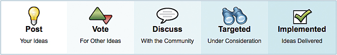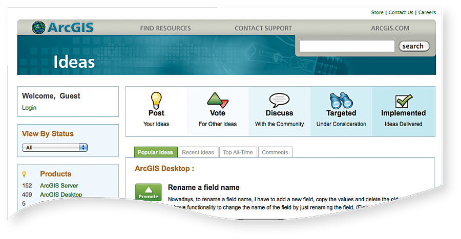 Esri launched the ArcGIS Ideas Web site as a forum for users to suggest new products and improvements, vote for their favorites, and discuss ideas submitted by others. Users can submit ideas by product, service, or specific industry, including everything from small tweaks to existing ArcGIS features to groundbreaking new ideas. The Ideas Web site is designed to provide Esri developers with direct customer input. Through voting and discussion among users, suggested product improvements can be refined and prioritized. The site also creates a stream of constant input and opportunity for ongoing dialog between users and Esri.