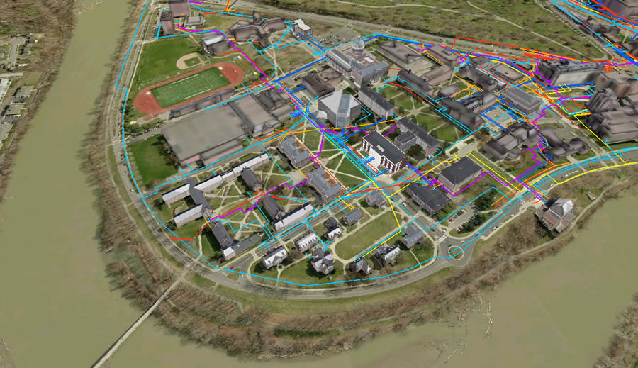 The utilities are in the process of being represented as seamless layers for each system instead of isolated drawings containing multiple systems. This will greatly simplify the internal "call-before-you-dig" process. Instead of sorting through thousands of drawings and trying to mentally edgematch them, employees at Central Utilities will have access to a 3D model of the university with utility systems completely mapped. This solution should enable the university to significantly recoup the previous investment from its library of utility drawings and surveys.