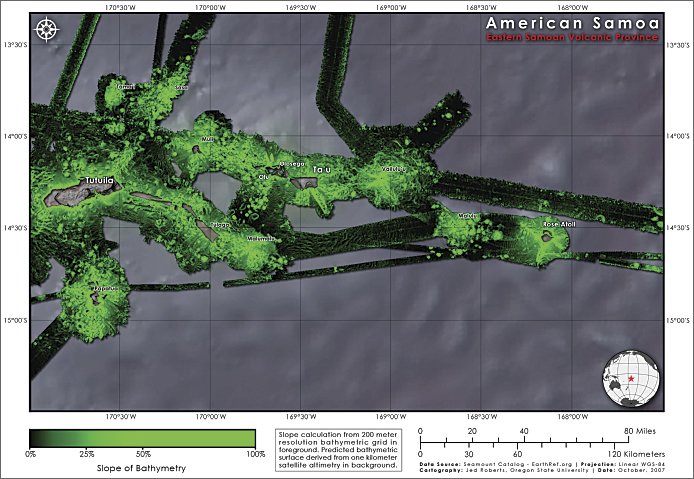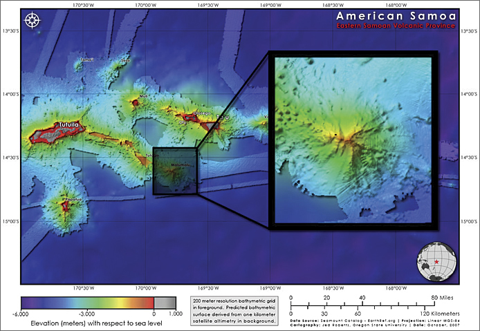 Roberts, J. The Marine Geomorphology of American Samoa: Shapes and Distributions of Deep Sea Volcanics. M.S. Thesis, Oregon State University, Corvallis, OR, 2007.
