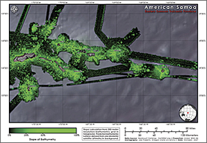 Slope calculation of multibeam bathymetry of American Samoa and the broader Eastern Samoa Volcanic Province reveals scores of seamounts (51 previously undocumented). The slope grid is 200-meter resolution.