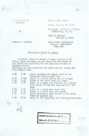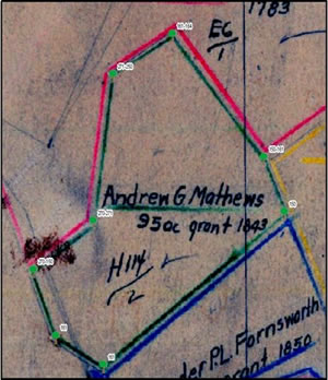 Common names used for tree species had to be related to common names likely to be found in old survey records. Each polygon that represented the first parcel surveyed for the area was also given a point referenced by the individual locator number, generally in the center of the polygon. The deeds describing the parcels were used to determine survey corners on the maps and tally the tree species or other markers used to witness those corners in the attribute file. Along with tree species, the locator number, date of the deed or survey, and deed holder's name were recorded in the ArcGIS geodatabase.