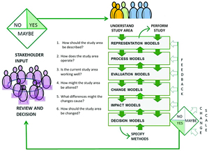 How might the landscape be changed or altered? What differences might the changes cause? And finally, What should we do?/How should it be changed? Those are the six questions, but each one of those has sub questions. And you have to ask those at least three times during the course of any study or project. The first time you're going down the questions, and that's typical, because you start by saying, Where are we? Right? So those are the why questions. And that's scoping the project, figuring out why you're there in the first place, why you are worried about this issue or place or whatever. And the second pass is in the reverse sequence, the how questions. You start with, What do decision makers know? How will they judge whether they've got a good design? And it's the same questions, but you're not starting with data. I think it's a huge mistake to start with data.