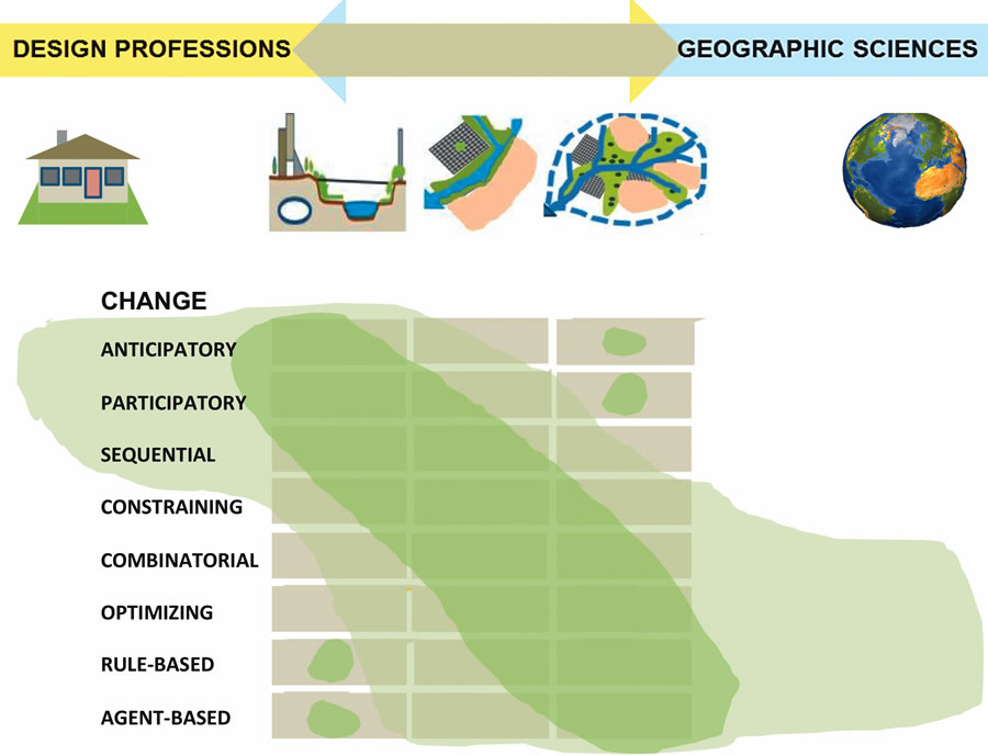 A hypothesis regarding the relationship between geographical study area (size and scale) and change models. Source: Carl Steinitz