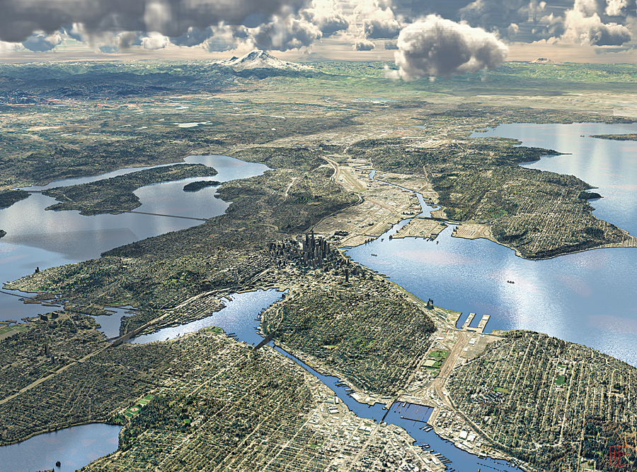 This simulated aerial view over Seattle can provide King County planners with an eye in the sky wherever they need one. (Created by Victor High, senior GIS analyst)