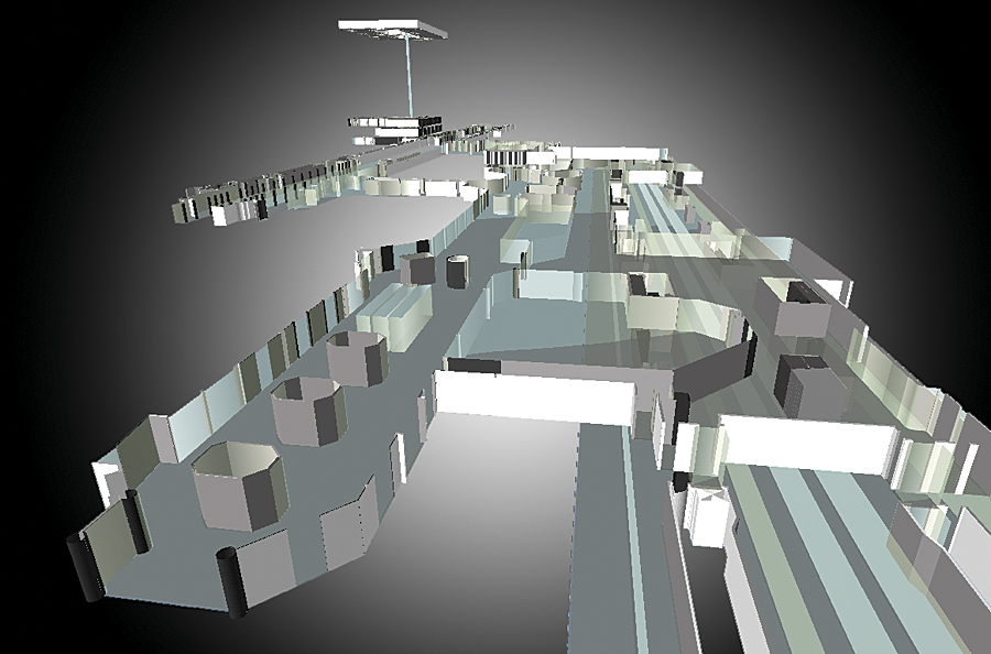 A Trimble TIMMS unit was used to collect data points of every object in the space that was mapped, from walls to doors to desks and chairs.