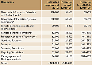 Estimated 2010 US employment for 10 geospatial occupations, along with projected employment growth through 2020. (Source: US Bureau of Labor Statistics, available at onetonline.org)