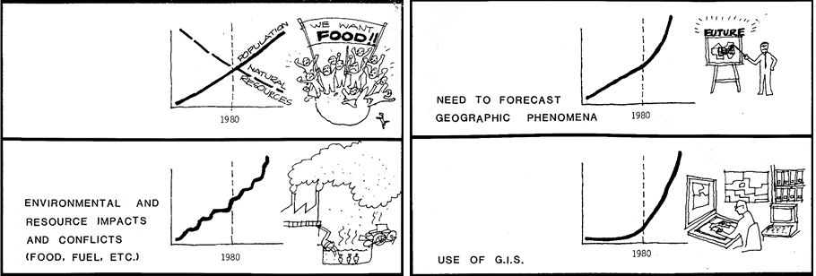 Jack Dangermond produced these drawings by hand for the 1979 URISA conference. Here he looked into the future with 1980 as a near-future milestone.
