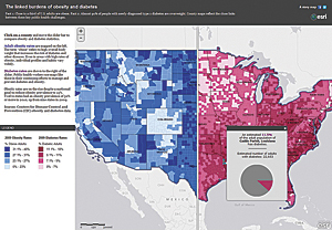 The swipe tool helps users quickly compare different maps—in this case, obesity and diabetes rates. Also, see the dramatic poster in the center of this magazine.