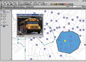 Above left: Bus stops with routes can be shown along with pictures of students getting on at each stop. In addition, the software provides an accident-tracking module so a user can more easily assess if there is a dangerous stretch of road along a school bus route. The software can also be used for fleet inventory, where the number of buses, equipment, engines, and other equipment data can also be maintained and analyzed. The success of Central Valley and others has resulted in more than 50 districts across the country using the software, and the high-tech boom in school districts is ever expanding. For example, school districts use GIS to geocode their student databases and ask questions such as What are the locations of students with the highest grade point averages? and Why? "We use ArcView GIS as our GIS engine to look at a number of variables," says Somerville. "For example, we'll use GIS to see if there is a relationship between test scores and kids getting a meal at school versus kids who do not. GIS gives us a powerful technology to automate and integrate all data related to students and to use query capabilities to look at problems in a new way." For more information, contact Kerry J. Somerville, EPS (e-mail: kerry@smartr.com), or see the web site http://www.smartr.com. |