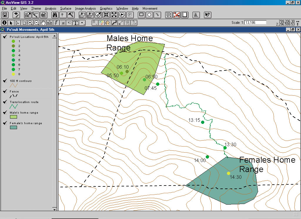 On May 4, 2002, a small group of scientists working for the Maui Forest Bird Recovery Project, Hawaii, caught and translocated one of the world's most endangered birds. This was done in a last ditch effort to save the Po'ouli, a critically endangered Hawaiian forest bird, with a known population of only three individuals. It was a culmination of many years of work by several state and federal agencies, and GIS was an integral part of its success. The Po'ouli, or black-faced honeycreeper, is found in an extremely rugged and remote area of rainforest on the windward slopes of Maui, Hawaii. This area is between 5,000 and 7,000 feet in elevation and averages more than 365 inches of rain per year. At the time of the species discovery in 1973, there were thought to be roughly 140 individuals. Its population has been in a steady decline, and since 1997 only three birds have remained. Each of these birds lives in separate areas of the forest, and close field monitoring has indicated that there is little chance of natural pair formation. By 1999, with no new individuals, and no sign that the three birds would interact and breed, the U.S. Fish and Wildlife Service and the State of Hawaii Division of Natural Resources reached a decision to move one of the two females into the lone male's home range. The task of carrying out this translocation attempt was assigned to the Maui Forest Bird Recovery Project. To accomplish this task it was necessary to catch one of these females using mist nets. Trying to catch an individual bird is always difficult. The solution was to map the birds' home ranges using past field sightings. Marked sightings in the field dating back to 1998 were collected with a Trimble Pro XR GPS unit. Unmarked sightings were approximated in ArcView 3.2 using bearing and distance measurements from fixed locations in the field based on recorded field observations. The scientists then used the Animal Movement Analysis extension to ArcView to identify home ranges for each of the birds. This extension was produced by the United States Geological Survey Alaska Biological Science Center and contains a wide range of functions useful in the analysis of animal movement. The team created home ranges using the kernel analysis function. Field biologists then used this analysis to place nets, which maximized efforts to capture two of the three remaining Po'ouli. Radiotelemetry platforms were constructed months in advance. The team tested its method by radio tracking people within the Po'ouli home ranges. The plan was to first capture the male Po'ouli and attach a radio transmitter to his back. Using radiotelemetry and Location of a Signal (LOAS) software, his movements throughout each day could be monitored in the field. LOAS uses the coordinates of tracking location and bearing data from that location to angulate the position of a radio transmitter. It allows the input of multiple bearings in spreadsheet form and the export of locational data as ArcView shapefiles. This information would be used to locate the male in the field once the female was captured and brought to the male's home range. The female would then have a radio transmitter attached to her and would be released near the location of the male. It was hoped that if the two Po'ouli came into contact, the female might stay in the male's territory or the male would follow the female back to her home range.