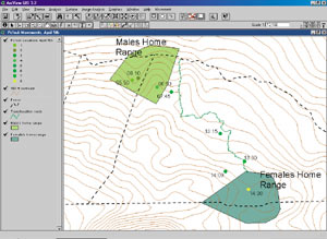 The team's effort first focused on catching the male for transmitter attachment. Although the male was sighted frequently, he still had not been caught after the team had spent 30 days in the field. The team then decided to focus on catching the female. This was done to complete the translocation before the end of the suspected breeding season. Since the male's daily movements could not be traced by radiotelemetry, the release site of the female would have to be determined by using maps created in ArcView with the Animal Movement Analyst extension if the male could not be located visually. The team created maps using the kernel analysis function with the most recent sightings of the male Po'ouli. Further fieldwork was scheduled, and the team relocated to the female's home range. Again, the team used home range maps created from the female's resight history to help place mist nets in the female's territory. The team was concerned about the female's well-being because she had not been seen for more than eight months. However, luck was on their side; after 12 days, the female was caught. After taking a few quick measurements, the team placed her in a transport container and hiked 2.5 kilometers to the male's home range. After a one hour and 15-minute hike, the team fitted the bird with a .8 gram radio transmitter and placed her in a holding cage where she could be monitored prior to release. After the team rechecked the transmitter signal and receiver frequencies, they carried the female into the male's home range. Despite focused effort, the male could not be found. So the team decided to release the female based on kernel analysis of dusk sightings of the bird during the previous three weeks. Upon release, the female was radio tracked after sunset to determine whether or not she roosted in the male's territory overnight. Previous translocation and release work with other species indicated that there was a high probability that she would immediately fly back to her home range. The following morning radio tracking began before dawn. The female's signal was still being received in the male's home range, but shortly after sunrise she began to move. Telemetry results show that the female stayed in the male's home range until approximately 10:00 a.m. Throughout the rest of the day, however, radio tracking confirmed that she was heading directly back to her own territory. The radio tracking team managed to track her progress and was able to triangulate her position several times during her return. Within 24 hours of her capture, the female Po'ouli was back in her original home range, covering a distance of more than 1.7 kilometers and an elevation gain of greater than 1,000 feet. There was no indication that the two birds ever came into contact with each other. Although the female's return was obviously disappointing, there was still considerable work to be done. Radio tracking continued for the next nine days until the transmitter battery expired. The data collected was continuous and on a much shorter temporal scale than other data collected previously for this species. It contributes greatly, however, to the knowledge of this species and will play an important role in future work. Since no breeding pair was formed, a new strategy is being formed to save this species. It seems likely that the next step for this species will be to try and breed them in captivity. If so, then GIS will also contribute to this next phase of the recovery effort. Information gathered during the translocation will be used to recapture these individuals. For more information, contact Bill Sparklin, Maui Forest Bird Recovery Project (e-mail: poouli@maui.net, Web: www.mauiforestbird.org). |
