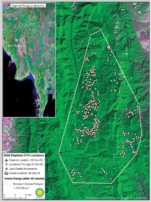 The Conservation and Research Center (CRC) (Front Royal, Virginia) of the Smithsonian Institution's National Zoological Park (Washington, D.C.) has one of the most extensive programs of conservation biology research in the world. Researchers at CRC have been studying the plight of the Asian elephant, which is listed as endangered on the World Conservation Union's Red List of Threatened Animals. Unlike the 300,000 to 500,000 remaining endangered African elephants threatened by ivory poaching, Asian elephant populations are decreasing primarily because of habitat loss. The human population explosion in Southeast Asia has forced an aggressive conversion of natural lands into agricultural lands. The resultant deforestation reduced the elephant habitat by approximately 70 percent during the last 30 years. It is estimated that only 30,000 to 60,000 Asian elephants remain in the wild. Peter Leimgruber, Ph.D., head of CRC's Conservation GIS Laboratory, is leading a team of researchers, graduate students, interns, and protected area wardens and rangers in studying the ecology of Asian elephants and their habitat throughout Asia and in two protected areas of Myanmar (Burma), specifically the Alaungdaw Kathapa National Park and Htamanthi Wildlife Sanctuary. Myanmar, about the size of the state of Texas (approximately 678,500 square kilometers [261,970 square miles]), is located in Southeast Asia, bordering the Andaman Sea and the Bay of Bengal, between Bangladesh and Thailand. Its diverse environments range from alpine meadows in the Himalayan Mountains to mangrove swamps near the Bay of Bengal. The Alaungdaw Kathapa National Park lies at the edge of Myanmar's hill region, close to the country's center, and is very steep and rugged. The Htamanthi Wildlife Sanctuary borders Kachin State in northern Myanmar, and traveling there requires three days of riverboat travel on Myanmar's famous Chindwin River. Its habitats are dominated by lowland rain forest and softly undulating hills with little topography. Leimgruber and his team are using Esri's ArcGIS software and ERDAS IMAGINE from Esri Business Partner Leica Geosystems GIS & Mapping to identify existing habitat, monitor habitat loss, and assess the effectiveness of Myanmar's protected area system with the intent of preventing local extinctions of Asian elephants and applying these methodologies to other species in the future. Esri's software has been used at the National Zoo in Washington, D.C., for the last 12 years. ERDAS IMAGINE was chosen for image processing because of its easy interoperability with ArcGIS software. CRC's Conservation GIS Laboratory is equipped with 16 Dell and Gateway desktop PC workstations. Several projects have been performed, including a regional assessment using GIS to determine how much habitat is left for elephants in all of Asia, a national forest cover map and mapping of two protected areas in Myanmar, and intense ground surveys of elephants (population locations and number of individuals), combined with satellite tracking (see photos and the exclusive online-only sidebar "Ground Surveys and Satellite Tracking of Asian Elephants") of one elephant herd, to monitor and identify their habitat selection in the protected areas. Regional Assessment