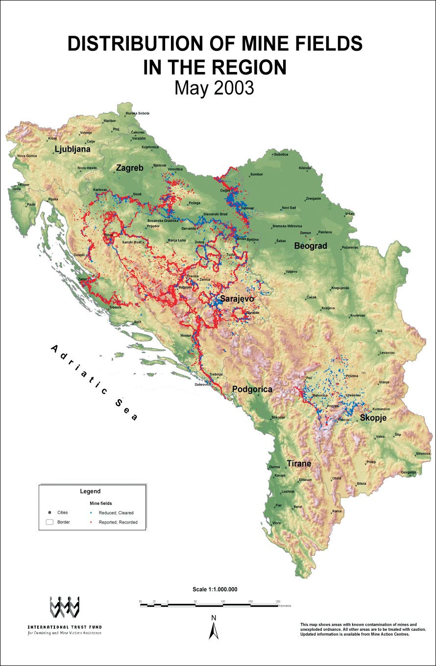 Describing the accident, he writes, "I slowly looked at Duale, whose face was covered with dust, then down to my feet. I saw a white bone sticking out where my right foot used to be. At first, I wondered if that was my bone or Duale's. It was mine." Later he observes, "Thus far, my medical care costs are in the neighborhood of a few hundred thousand dollars. What about the Somalis who are hurt by land mines? Who is going to help them? Who is going to pay for their care and therapy? There are thousands of victims around the world in places where having one's legs and arms is key to economic survival." Who indeed is going to help those unfortunate people? The International Trust Fund for Demining and Mine Victims Assistance (ITF) is now in its fifth year of funding and monitoring the demining activities in southeast Europe, which includes the countries of Albania, Bosnia and Herzegovina, Croatia, Serbia and Montenegro, and Macedonia. Full details of their programs are located at www.see-demining.org. This region has long suffered land wars and the inevitable resultant laying of land mines. It is estimated that more than two million mines and UXO were placed during the Balkan crisis alone. Annually, between 18,000 to 20,000 kilograms of UXO, primarily from World War I, are found and neutralized in Slovenia. Before ITF began its efforts to monitor and finance the demining activities in southeast Europe in 1999, there was no regional coordination of those activities. Each neighboring country had its own approach toward mine removal, and there was a general lack of opportunity to coordinate those activities as well as exchange information and experience. Upon the formation of ITF, the European Commission (EC) prepared and proposed a GIS project called the Geographical Information System for Mine Action in Southeast Europe (GISMASE), which was jointly funded by the European Commission and the U.S. Department of State and implemented by ITF under the scientific guidance and monitoring of the EC's Joint Research Centre.