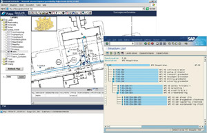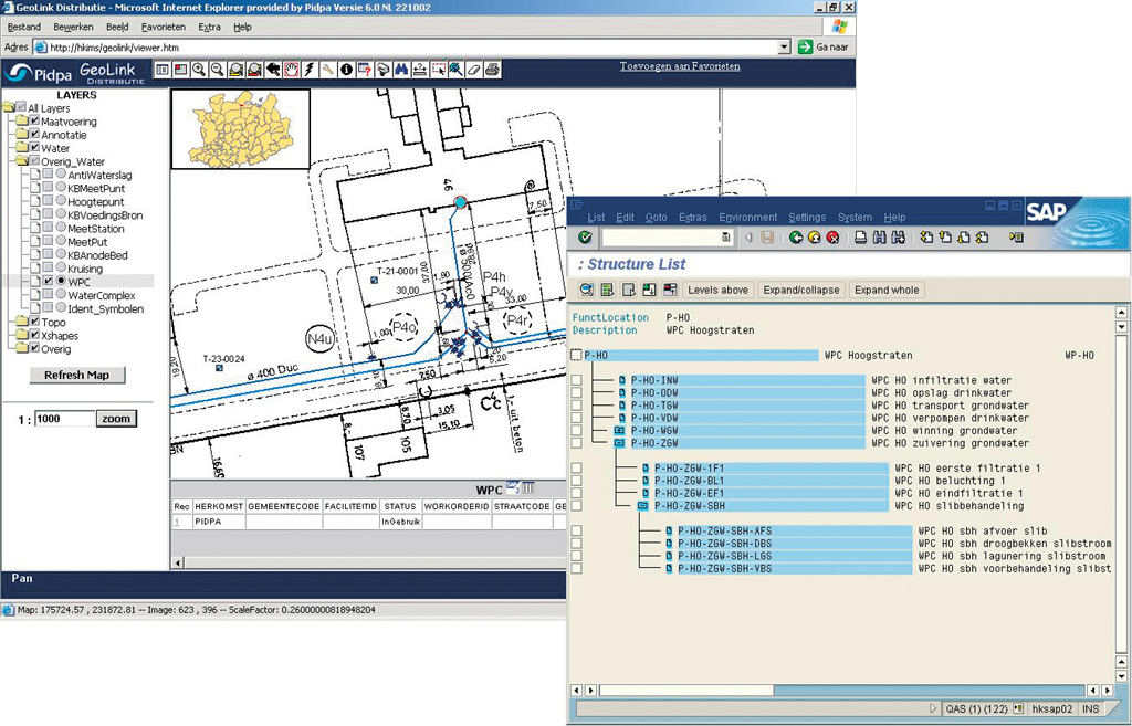 Pidpa is a drinking water supplier headquartered in Antwerp, Belgium, dedicated to providing superior quality drinking water to more than 1.1 million customers within its 2,581 square kilometer service area. The Pidpa service area is rich in aquifers from which it extracts groundwater for a carefully monitored purification process prior to release into its distribution network and subsequent consumption. The company's water network includes 26 water production centers, 62 water towers, and 12,000 kilometers of water mains, which are all part of the infrastructure that produces and distributes approximately 66 million cubic meters of water per year throughout the Antwerp province. Established more than 90 years ago, Pidpa demonstrates its belief in its motto "Water Is Life" through its day-to-day business activities and its continual striving to improve the quality of service to its customers. Approximately six years ago, after an exhaustive review process, the company chose to develop a GIS based on Esri's software. A key factor in its choice was the fact that the Esri GIS solution is based on an open system architecture and well-established industry standards. Comments Ren� Horemans, GIS project manager at Pidpa, "A key factor for us in the implementation of our GIS was the development of the water distribution data model in close cooperation with Esri. It has evolved to become a standard part of Esri's GIS solution for the water industry." Pidpa's corporate GIS includes ArcSDE for a centralized database management system running on top of a SQL Server database. The ArcGIS product familyincluding ArcInfo, ArcView, and ArcFM (from Esri Business Partner Miner & Miner, Fort Collins, Colorado)provides specialized GIS tools tailored for the water utility industry. "We focused on using as much standard software as possible and limiting the number of custom tools," says Horemans. "By avoiding costly recustomization with each successive release of the core software, we save a great deal of time." Pidpa recently expanded its GIS with an ArcIMS implementation called GeoLink to provide easy viewing access to geographic data, which is linked to corporate data used by a large group over the company's Intranet (see "A Technical Overview: How Pidpa Links GIS With ERP, CIS, and SCADA"). The focus of the GIS project was to provide a database-centric and rich functional solution for the maintenance and management of the water distribution network. Pidpa started by creating a powerful GIS environment so the editors could efficiently create complex design maps for new construction work, maintain existing network data, and do in-house raster to vector conversion. Part of the project included the scanning and ongoing conversion of existing topographic and water network raster data with the aim of building a seamless hybrid database. In addition, 90,000 synoptic sketches were scanned and linked to the new database. Use of the hybrid combination of raster and vector data resulted in immediate benefits: having only one set of geographic data in a central database instead of several paper copies of maps in different offices was a giant step forward. In addition, creating design maps immediately in the GIS instead of using a manual process of copying, cutting, and pasting on paper and having this information instantly available to everyone, was an important improvement. Integration With Other Information SystemsWhile the conversion process is progressing and the GIS edit functionality is an essential tool in the editors' day-to-day work, the focus has recently been directed toward providing GIS data and tools to other departments and the integration of GIS with other information systemsenterprise resource planning (ERP), customer information system (CIS), and supervisory control and data acquisition (SCADA). Pidpa's ERP application is SAP (Walldorf, Germany). Each of these information systems has its own characteristics. They can be deployed on heterogeneous hardware (mainframe versus Windows servers), have different software architectures (client/server versus Web-based), have their own data models, and have their own graphic user interfaces. In many cases it is very useful to have specific information available that is hidden in different systems. An issue becomes the accessibility of information in all the different systems. Typically, the only place where interaction is prebuilt is between the different modules within a single vendor's information system. For all other intersystem connections, organizations have to take care of integration themselves using the products and techniques available in the market and the APIs provided by the information system vendor. That is what the GIS-centric concept is all about. Regardless of the integration mechanism, end users get access to the disparate data in a common, familiar map-centric GUI that makes query and analysis of the data easier. To this end, Pidpa deployed GeoLink for the ArcIMS implementation. Working with a flexible site in a standard Web browser allows the GIS to be opened up as a portal to a broad user group. Currently the GeoLink application is rolled out to approximately 100 users who use it to access the geographic data about the water distribution network. A user can now easily use a geolocator tool to choose a position on a street in a municipality and select one or more connection points from which detailed order information can be retrieved in the SAPGui application. When a substantial problem occurs in the network, an extra note is made in the GIS by means of a calamity point. This process allows Pidpa to analyze the network and determine weak areas (e.g., where a replacement of older water mains is necessary). There are also work flow processes that need an interface from SAP to GIS. When a new order is created in SAP, often a detailed map of the location is necessary. By adding another tab sheet in the SAP order module, users can easily acce