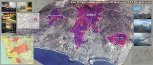 At these morning briefings, firefighters were shown full-size plots with the progression of the fire, where the fire was active or contained, bulldozer lines, and other critical data such as supply drop points and water sources. These maps detailed which section of the fire line each division was responsible for and were supported by more detailed 11" x 17" map packets handed out to division group supervisors, branch directors, and strike team leaders. On these sheets, firefighters charted their assignments for the day, utilizing the information on roads, buildings, water sources, drop points, and staging areas contained within. Creating numerous informational resources for managing the fire, GIS team members enabled decision makers to plan effectively in their allocation of hand crews, bulldozers, engines, aircraft, and other assets. "If we didn't have these maps, the firefighters wouldn't have known where to go, how to get there, or what their assignments were," says Jeff Harter, situation unit leader, CDF. "Using GIS we could pull all of the necessary information and help them make their plans of attack. It is amazing how much difference it makes to have good quality maps that are easy to understand and tell a story." Local Groups Give Insight, ExpertiseCDF and NTFI were not working alone. GIS professionals throughout the area converged to help, working around the clock, their own homes at risk from the devastating blaze. Numerous local agencies donated time and resources including Esri, County of San Diego, HewlettPackard, San Diego Association of Governments, San Diego Geographic Information Source, Space Imaging, and U.S. Forest Service. "The outpouring of support and the overwhelming cooperation between the public and private sectors was incredible," says Harter. "We didn't have to ask them, they came to us. Software, hardware, and data providers contacted us immediately and offered us any type of assistance we needed. This helped us tremendously. We wouldn't have been able to do all the mapping we needed without this." "We all brought something different to the table," says Tim Craig, regional account manager, Esri, San Diego. "We were able to use our various strengths, knowledge of the software, and knowledge of the area's data sets to get firefighters the information they needed. This was a great example of bringing local resources to bear on a regional emergency. Having the knowledge of locals was often an asset when adding details to maps and identifying particular locations. I think all the agencies involved, and those that weren't as well, can learn from this and work to get relationships built before an emergency happens, so that if/when an event happens again, the local, state, and federal groups can work together even better, and even sooner." For more information, contact Jeff Harter, battalion chief, California Fire Plan, California Department of Forestry (tel.: 916-327-4983, e-mail: jeff.harter@fire.ca.gov). |