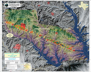 Debris density over 10-meter DEM produced for environmental hazards modeling. (Map courtesy of Forest Resources Institute. Digital Elevation Model courtesy of USGS. Vector data courtesy of Texas Natural Resources Information Systems.) |