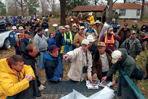 FRI staffer Terry Corbett (center) uses a map to point out current conditions to search and recovery team. (Photo by Hardy Meredith/SFASU Public Affairs.) |