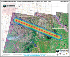 The space shuttle routinely flies over Nacogdoches County in eastern Texas on its way to land in Florida and was expected to fly over that morning. Shortly after the explosions, Williams called Blackwell to discuss the situation. They knew that the Space Shuttle Columbia and the STS-107 crew had gone down in disaster. They said good-bye to their families and headed into the office for what was to become a 14-day geospatial first response effort. It was 8:15 a.m.
