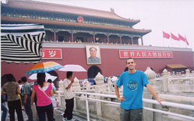 Bryan Lightner, GIS specialist with the Philadelphia, Pennsylvania, City Planning Commission, recently visited China for a five-week professional planning exchange program. He explored such cities as Beijing (pictured), Shanghai, and Hangzhou. The exchange was between Philadelphia and the city of Wenzhou, located along the "gold coast," southeastern Zhejiang Province. Wenzhou city planners have been taught how to incorporate public participation into their neighborhood planning process, as well how to better use urban design guidelines and GIS technology to help cope with their rapid growth. Beijing, it must be added, proved to be a great backdrop for photographing his Esri T-shirt. |