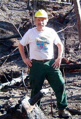 Larry Costick, research ecologist and wildfire GIS specialist for U.S. Forest Service Burned Area Emergency Response teams, worked to finish spreading rice straw (background) to minimize rain impact and help stabilize soils after the Sims Fire destroyed valuable forests adjacent to the South Fork Trinity River near Hyampom in northern California. Of course, his Esri T-shirt stayed clean and sparkling through the entire operation.