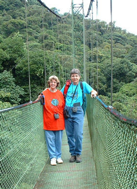 | Pat Raimondo (right), a geography graduate student at Texas State University-San Marcos, and Mary Beth Booth, who is on the faculty at Austin Community College where she teaches GIS, recently visited Costa Rica as part of a GIS in the Jungle Class sponsored by Esri Business Partner GISetc and Texas State University. In this picture, they are wearing Esri "I Love Geography" T-shirts while standing on one of the suspensions bridges of the skywalk near Monteverde cloud forest. Mary Beth tells us, "It was an amazing experience." We are tempted to believe she is referring to wearing the T-shirts, but she is more likely speaking of being way above most of the canopy of the rain forest. |