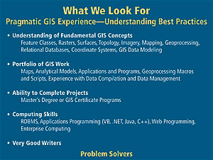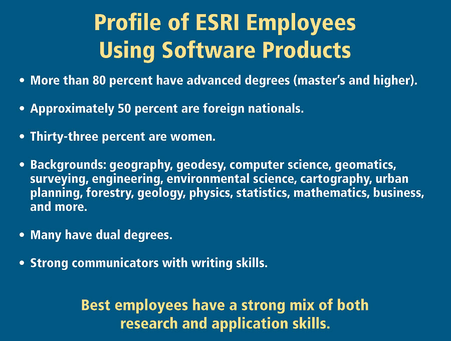 Given the difficulties encountered in establishing membership criteria and then the need to make an "in or out" decision with respect to individual organizations and their components, it is not surprising that we currently have only minimal knowledge of the existing geospatial workforce. We are unable to speak in any definitive way even to questions of simple demographics, such as the composition of the geospatial workforce by age, gender, race, citizenship, duties that they perform, or the locations where they work and reside. We also know little on an industry-wide basis about current job descriptions, educational backgrounds, and what knowledge and skills are needed and desired for each position, etc. An interesting example of some of the kinds of things we should know on an industry-wide basis may be found in a presentation given by Clint Brown, Esri's director of Software Products, in San Diego, California, in July 2005 at the Esri Education User Conference. Esri Software Products works closely with Software Development and currently employs just over 200 workers. One major component of Esri's participation in the geospatial industry lies in the tool constructing and testing category identified earlier. Such activities clearly require an advanced level of education and training compared to, for example, organizations whose primary concern is with more routine application of existing geospatial tools. Two illuminating slides from this presentation are shown here as figures 2 and 3. Figure 2 provides a brief profile of the employees in Esri Software Products; of special note are the number of individuals holding advanced degrees (80 percent), the high proportion of foreign nationals (50 percent), and a significant number of women (33 percent). Also of importance is the very heterogeneous disciplinary background of the employees, including many who hold dual degrees. In figure 3, we see a list of some of the general skills that are considered desirable for work in this area. Prominent here are advanced knowledge and experience in both GIS concepts and computer and information technology. In light of the item mentioned at the bottom of figure 3 (problem solvers), it is interesting that in informal discussions I have had with a large number of users and developers of geospatial technology they stress the extreme importance of their workers' ability to