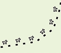 Rules are made up of one or more visual layers, each of which starts from the feature shape geometry and has an optional chain of geometric effects and placement styles that are applied dynamically prior to rendering with a basic symbol (marker, stroke, or fill). Figure 2 shows the data flows during symbolization of a cartographic representation added to a GIS line feature. The shape field of the feature has a representation rule applied, which generates two visual layers, the first of which goes through two geometric effects (an offset to one side, then a dash pattern) before having a basic symbol (stroke) applied. The second layer has one effect applied (a marker placement pattern) before the basic symbol (animal marker) is applied. Figure 3 shows a typical visual result of such a rule.