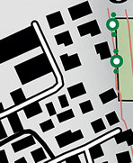 The new cartographic representation and override capabilities coming in ArcGIS 9.2 will support the complete cartographic production process within the GIS. Outputs include plot files for direct printing, image formats for Web or graphics publishing, and Adobe Acrobat PDF files for imposition, separation, and manipulation by prepress software. Representations and OverridesCartographers have always had difficulty in resolving the conflicting pressures of automation (rule-driven visualization) with those of cartographic clarity (freedom of expression). The new representations and override system in ArcGIS 9.2 unifies automation and freedom capabilities and resolves many of these problems. A small amount of information is added to geographic feature classes in a geodatabase to store representation rules and graphic overrides for individual features. Line ExampleRepresenting linear features unambiguously with patterned or dashed lines has traditionally been a challenging problem for cartographers. ArcGIS 9.2 provides a new solution to this and similar problems by supporting high-quality automatic representation of GIS features, while at the same time providing the flexibility to override the automated rules. Clear and attractive maps can thereby be efficiently produced. Figure 1 (above) shows five stages of symbolization for linear road or "track" features from a vector topographic GIS dataset (data copyright swisstopo). Traditional GIS-based mapping systems support only the first two stages. In stage 1, default GIS symbology (a red line) is assigned to the linear features, and in stage 2, a dashed line symbol is applied, as this is the typical line pattern used in cartographic products for tracks. This GIS symbolization falls short of many cartographic requirements because the poorly symbolized line intersections and bends (highlighted by the red circles) lead to ambiguity as to where the tracks start and end. Stage 3 shows how the new representation capabilities can automatically produce better symbology at line intersections by adjusting the line dash pattern to ensure intentional (half-dash) connections at the ends of all such line features. Stage 4 shows how the cartographer using this improved representation as a starting point can further perfect it by forcing the center of a dash to be placed at the sharp bend in the track in the northeast corner. This modification is stored in the database as an override to the representation geometry. Stage 5 shows the ultimate graphic freedom from the rules, where the cartographer has decided to change the color of some of the dashes and delete one dash from the other track. However, this "free representation" is still closely associated with the original feature. Representation StoragePhysically, a cartographic representation adds two additional columns to a standard ArcGIS feature class table within the spatial database. The source feature class stores point, line, or polygon geometries, as well as a set of additional attribute columns used for mapping, analysis, and data management. The cartographic representation columns store data that defines the representation rule used to symbolize a feature. They also store cartographic overrides, which are exceptions to the representation rule for a given feature. A representation system design premise was to avoid unnecessary duplication of data. Therefore, the extra columns that hold cartographic representations and overrides are minimal in size, and wherever possible, the representation information is derived dynamically from the existing GIS feature as it is needed. The structures used to hold overrides are flexible enough not to require separate columns for individual overrides. Representation RulesEach cartographic representation added to a feature class can refer to different rules for subsets of features within the feature class. For example, a roads feature class will typically have different rules for streets; first-, second-, and third-class highways; and freeways. It may also have variant rules for highways on bridges or in tunnels or for unique circumstances not normally part of the standard data model, such as a highway temporarily interrupted by a fair.