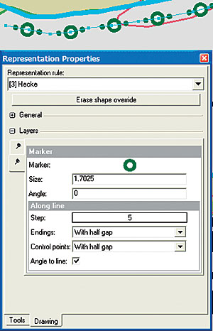 Rules can also be set up to use any existing field in the database as an explicit representation field to control the feature representation appearance. Such field values can be set by geoprocessing processes, which can use the full power of the GIS toolkit to determine the need and calculate the required result. A typical and powerful example is the use of the topology engine from within a geoprocessing tool to find all the cul-de-sac roads and set a database field, which is then used to control their line end style to be square rather than round (figure 4). Exceptions to RulesOverridesOverrides allow the user to change the values used by the rules for an individual feature. In figure 2, the override field can modify the input shape, the properties of the geometric effects, or any of the graphic properties of the symbols.
