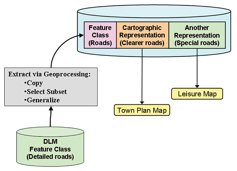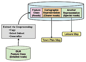 A set of intuitive geometric and representation property-editing tools is provided for defining and modifying overrides, based on tools and palettes familiar to a user of desktop graphics packages (figures 5 and 6). Figure 5 is the representation properties palette for a hedge line representation, using a pair of alternating symbols. It shows the range of graphic properties that can be overridden. Free RepresentationsA further level of exception is provided by the ability to convert any representation into a free representation. This makes an inline copy of the rules affecting the particular representation so that the rules can be changed for this one feature. This can include a change of geometry type (e.g., area to point), the addition of new rules or symbol layers, or the introduction of arbitrary new graphics. Being able to extend the data model in this way gives freedom to successfully represent features with appearances too rich to model otherwise, such as a railway siding area where the representation should just show a typified subset of lines indicating that "there are many railway lines here." It also allows repositioning or suppression of individual graphic elements of the symbolization, such as individual dashes of a road tunnel to avoid important features at ground level, as in figures 7a and 7b. Cartographic Editing ToolsThe introduction of focused cartographic representation editing tools (figure 6) allows cartographers who currently prefer to use graphic software to work even more efficiently in a GIS-based environment. For example, representation editing tools work similarly to tools found in common desktop graphic packages. Furthermore, many of the newly introduced tools are particularly efficient because they are designed with specific cartographic tasks in mind. Editing of representations takes place within the same versioned editing environment supported by ArcGIS for editing vector feature classes so users have undo/redo capabilities available. Cartographic Data Models and WorkflowsThe workflow and data model best suited for cartographic production will vary considerably between organizations. The following sections outline different cases covering increasing levels of complexity. Simple workflow caseIn the simplest case, an organization has existing GIS data in a feature class and wants to use it to produce a high-quality cartographic product. In this case, it adds a cartographic representation to the feature class (figure 8). Multiproduct caseIn the next case, an organization has existing GIS data in a feature class and wants to use it to produce more than one high-quality cartographic product at similar scales. In this case, it adds a cartographic representation for each product to the single feature class (figure 9). Landscape and cartographic caseIn the third case, an organization has a master database that is maintained to be true-to-ground and wants to use it to produce cartographic and noncartographic products (such as navigation routes for an in-car voice guidance system). We refer to this master as a digital landscape model (DLM). For cartographic production, the organization requires the extraction of requisite data from the DLM by selection and generalization into a digital cartographic model (DCM), which can then be enhanced with multiple representation capabilities as in the multiproduct case (figure 10). Enterprise strategy caseFigure 11 gives an outline of a future large-enterprise workflow that extends the DLM/DCM case to where multiple products of different types at different scales are to be produced dynamically. Here, the data flow must encompass both model generalization (deriving landscape model features at coarser resolution by selection, aggregation, and simplification), and cartographic generalization (deriving visually appropriate features by applying displacement, exaggeration, and typification), taking into account the symbolization widths and sizes. Such automated and incremental generalization is challenging, but Esri is working on providing appropriate tools within the ArcGIS geoprocessing framework. Once cartographic data appropriate to the scale band has been derived, then the multiple representation and override capabilities can be applied. These handle the symbology requirements and geometric differences for the product specifications needed to produce the various products. Cartographic EnvironmentThe cartographic representation and override capabilities described above fit into the rich and powerful ArcGIS environment, and cartographers can take advantage of GIS capabilities for topology, geoprocessing (e.g., generalization), layout, 3D, etc. The market-leading Maplex text placement application has been reengineered and built into ArcGIS as a label placement engine (figure 12). This can greatly reduce the previously labor-intensive task of generating and positioning text for cartographic clarity. In 9.2, there are substantial improvements to labeling and leader placement, and development will continue on specialist labeling strategies, such as contour laddering. Cartographers can also take advantage of other extensions and layered products in the Esri software suite. In particular, the Production Line Tool Set (PLTS) provides a software layer on top of ArcGIS to automate and optimize the cartographic workflow and the daily tasks of operators. It provides a set of interactive toolbars and automated processes targeted directly at cartographic production. PLTS, using the underlying geodatabase, provides facilities for defining a map series, then generates the map sheets automatically with appropriate marginalia and titles. It can also create an atlas made up of multiple pages with overlaps and page grids. Styles, layouts, and marginalia for common civilian and defense mapping styles are provided. The approach of using the database not just for the feature data but also for layouts and product metadata is a key aspect of the database-