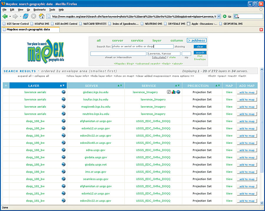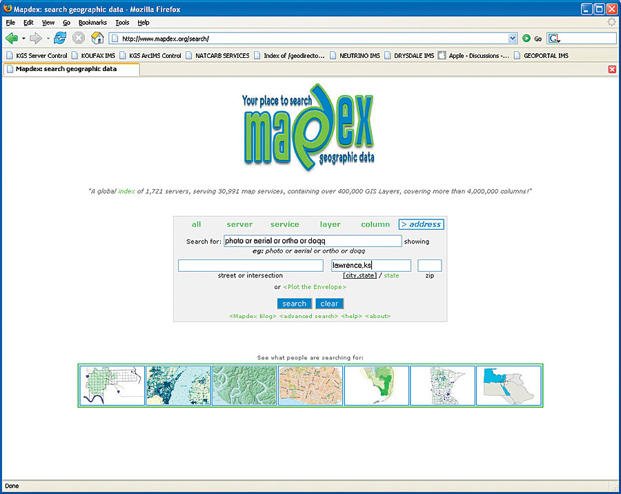 The world of GIS and spatial data is growing by leaps and bounds. Faster, more powerful software that is easier to deploy than ever is resulting in users doing tremendous things with GIS technology worldwide. The Internet, distributed systems, and other GIS networks are connecting this growing world of users, as well as providing a better means for making data accessible around the globe. And as the GIS community expands, the question is: How can people wade through the vast stores of spatial data to get the information important to them? Conversely, how can data producers effectively make their datasets available to those who need them most? Questions such as these have been the driving force behind an innovative data distribution solution, one that's been making quite a stir in the GIS and information technology (IT) communities: Mapdex (www.mapdex.org). Mapdex is an extensive database portal searchable by spatial layers, fields, and map service names. Ever evolving, the project provides users with access to a large and growing number of map services. For the GIS community, this is a tremendous boon; specialists in many industries can locate and use data already created. They can also learn about its origin, date of creation, scale, and a myriad of metadata variables. "I found that there is much GIS data available to the general public and GIS users through Internet map servers, but I also found that users would not find this information easily by using traditional search engines," says Jeremy Bartley, assistant GIS coordinator and Geoinformatics Project lead of the Kansas Geological Survey at the University of Kansas. "The public needed a way to search the actual data behind the interactive maps, and this was the impetus behind Mapdex." Mapdex provides an index of publicly available ArcIMS services comprising approximately 1,715 servers, serving approximately 30,000 map services, and containing approximately 475,000 GIS layers. It brings together a previously disparate network of GIS services, searchable from one location, that can be tapped into by the GIS community using just a few keyword searches and mouse clicks.