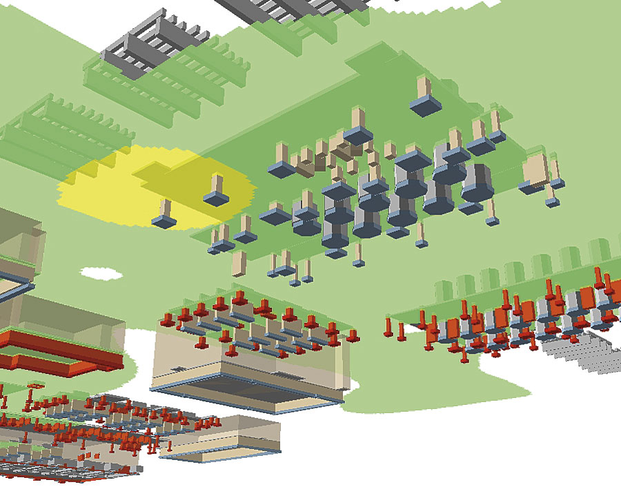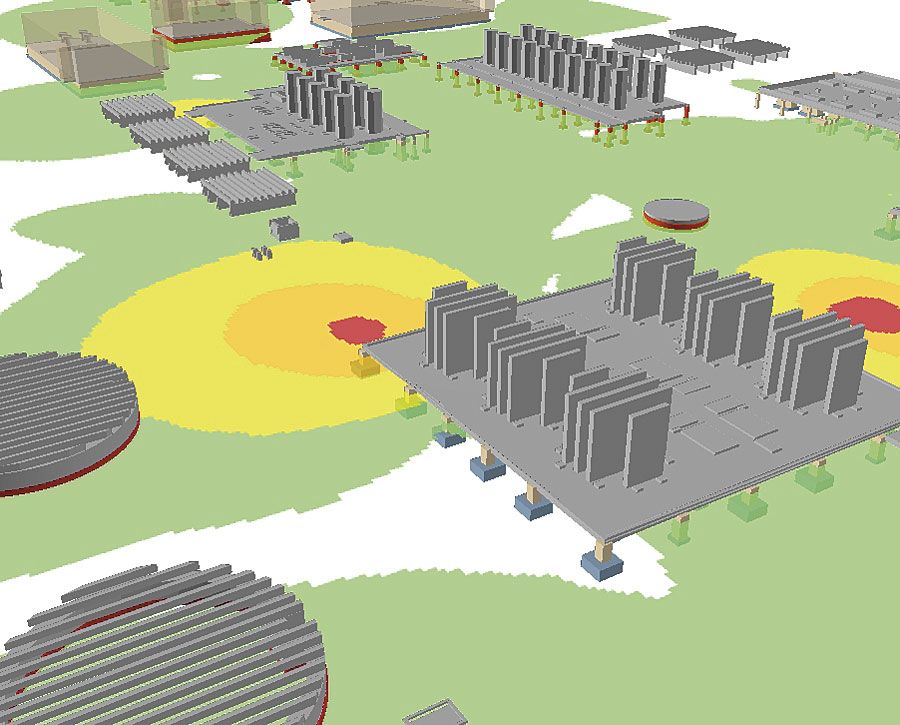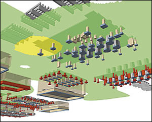 It is most cost-effective for the army to have only the contaminated soils removed. Where concrete foundations exist within the contaminated areas, the concrete must also be removed, which is more expensive than soil removal. Some concrete foundations were as much as eight feet deep, which complicated the process of ascertaining an approximate cost for excavation. A Three-Dimensional ViewManagers needed to see a three-dimensional view of both contamination and concrete. Contamination data was overlaid onto the concrete foundations data and volume information so that the amount of concrete and soil to be removed could be calculated. Then costs and level of effort for the project were projected. To determine the extent of contamination, geologists needed to see where the contaminated area boundaries were and how the concentrations were distributed. They performed multiple borings and took soil samples at several depths. The positions of the borings were recorded using ArcPad on a Thales MMCE GPS with submeter accuracy. These points were supplied to the GIS manager who plotted them against a basemap of the site. GIS was used to create a triangulated irregular network (TIN) of the site area. Then a surface of contamination was created using the depths of the samples with contaminant "hits." Next, a nearest-neighbor algorithm within ArcGIS 3D Analyst was used to determine the contaminated area based on the boreholes and their resultant values. The results were projected onto the contaminant surface TIN and assigned a thematically colored legend based on concentration value. Values below the WDNR threshold for remediation were discarded, and the final result was a spatially accurate three-dimensional model of the extent of contamination. As a last step, geologists decided that because no contamination results were deeper than two feet, and that two feet was the maximum depth that an excavation would go, it was not necessary to project onto a contaminant surface TIN. It was easier to assign the contaminant model a uniform offset of negative two feet off the site surface TIN. ModelingA model for concrete data also had to be created, and data needed to be digitized so that it could be used in the GIS. When the site structures were built from 1941 to 1942, each structure was documented with an as-built engineering drawing done by civilian draftsmen working for the army at the time. These drawings still exist on paper and microfiche, but both sources are in very poor condition and, in some cases, illegible. These were the source maps for modeling the concrete. Foundation structures were categorized into three basic categories: slabs (including on-slab structures, such as motor pads), support columns, and footings. Shapefiles were created for each category. Working from the as-built sources on a building-by-building basis, the two-dimensional geometries (length and width) were digitized using the precision entry tools of ArcInfo. The length, width, and height values were then entered into the attribute records of each separate structure, along with depth offset values. Other descriptive data about the building was also included in the model for future use. Digitizing data for the 16 buildings and 32 tanks in the project area took approximately 90 hours.