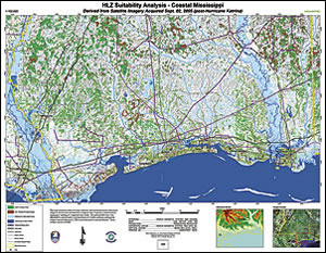 Immediately after Hurricane Katrina struck the Gulf Coast, first responders were working on ways to supply aid to residents in the hardest-hit areas. Helicopters had the ability to rapidly arrive in isolated locations, but with the terrain altered from flooding, pilots U.S. Army Space and Missile Defense Command/U.S. Army Forces Strategic Command (SMDC/ARSTRAT) Measurement and Signature Intelligence/Advanced Geospatial Intelligence (MASINT/AGI) Node, which is located at Peterson Air Force Base, Colorado, was tasked by United States Northern Command (NORTHCOM) to provide a potential HLZ map that reflected the posthurricane conditions along the coast of Mississippi. To complete this task, the MASINT/AGI Node integrated advanced spectral analysis of commercial satellite imagery with GIS analysis of supplemental datasets, such as elevation and land cover, and produced a map delineating potential HLZs that met specific criteria: