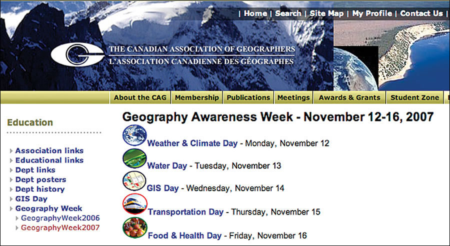 The Theme Days component of Geography Awareness Week (GAW) 2007, which took place November 12�16, was an innovative and perhaps daring Canadian experiment in geographic matters. What was put in place and how it was done are fully consistent with an adage that has guided my approach to curiosity- and client-driven research for four decades. That is, "If the research boat ain't rockin', it ain't movin'." I suggest that we achieved two very important and successful kinds of rocking and moving action as a result of the Theme Days experiment (www.cag-acg.ca/en/geography_week_2007.html). First, a Bit of HistoryIn June of 2006, I was asked to serve as Media Program Director for the Canadian Association of Geographers (CAG), and my task was twofold. First, I had to increase the participation rate of academic geographers in GIS Day 2006 and Geography Awareness Week and, second, to increase the media coverage of both events. Going into those events, two trends stood out: several inquiries revealed that many academic geographers seemed to have little interest in supporting GIS Day or Geography Awareness Week, and it was a major challenge to provide media people with a good reason for doing a story about either event, neither of which seemed to lend itself to easy, eye-catching stories for public consumption. But, after many years in public affairs, I was fully aware that it may not be the product that needs to do all the changing. Those four months of volunteer effort in 2006 resulted in an increased number of geography, environmental sciences, and associated university departments participating in GIS Day 2006. As for media coverage, releases about the two events were picked up by several dozen university newspapers and, as a result of releases and interviews, GIS Day and Geography Awareness Week received perhaps 50 mentions by community and weekly newspapers and cable television stations. To my knowledge, GIS Day and/or Geography Awareness Week were featured in about 10 big media stories, including those by The Weather Network. Nevertheless, in terms of having a significant, societal impact, it became apparent to me that something new and very different had to be done if Geography Awareness Week and GIS Day 2007 were to attract and hold the attention of a large number of Canadians. The important lesson learned was that we needed to go beyond the university-oriented approach for Geography Awareness Week to reach Canadian children, teens, and adults at school, at home, at libraries, at work in government and business, and especially those who visit Web sites for education, entertainment, research, business, and other purposes. Identifying Theme Days for GAW 2007Themes are widely used for conference programs, political campaigns, retail promotions, research papers, newspaper editorials, class lessons, databases, and maps. They are particularly useful for organizing thoughts, promoting ideas, creating a sense of focus and coherence, and inciting action. Further, from a project design perspective, the Theme Days model holds much appeal, as opposed to a weeklong theme that could consume huge amounts of time and resources and is likely to overtax people's attention spans. Therefore, the first two decisionsgoing with themes and Theme Dayswere easy. The process of identifying theme topics was output driven and based on several parameters. We wanted to increase attention on Geography Awareness Week, and four elements were central to achieving that outcome in the manner that I envisioned.