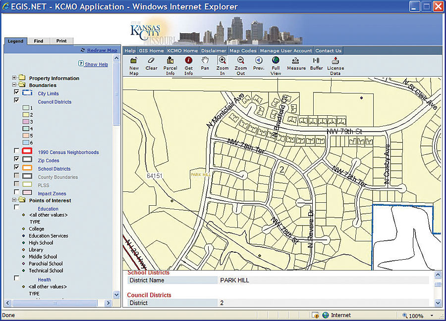 All these objectives were met in the course of the ensuing project. Centralized DatabaseThe early stages of the project included a user needs analysis and a system architecture review. Thereafter, a system architecture design was developed that utilized a centralized operational database for ongoing data maintenance and a publication database for data access for Web users and other read-only users, including the public. Both databases are based on ArcSDE and Oracle. Users maintain the data in the centralized operational database, and this database is used to refresh the publication database so the latter can be made more current. A script runs periodically to push data from the operational database to the publication database. Data MaintenanceTo maintain the data, the team developed software tools for the users in the various departments who have edit capability for the operational database. These users are primarily in the areas responsible for address, parcel, street centerline, and water/sewer maintenance. The maintenance tools for WSD were prepared by Esri Business Partner and subcontractor Marshall and Associates, Inc., of Olympia, Washington. Together, there are approximately 25 data editors and 100 query and read-only users for the database. Address RepositoryTo normalize the street addresses, the team developed an address data model specifically for Kansas City that was based on the standard ArcGIS Address Data Model. Highlights of the Kansas City address data model are as follows: