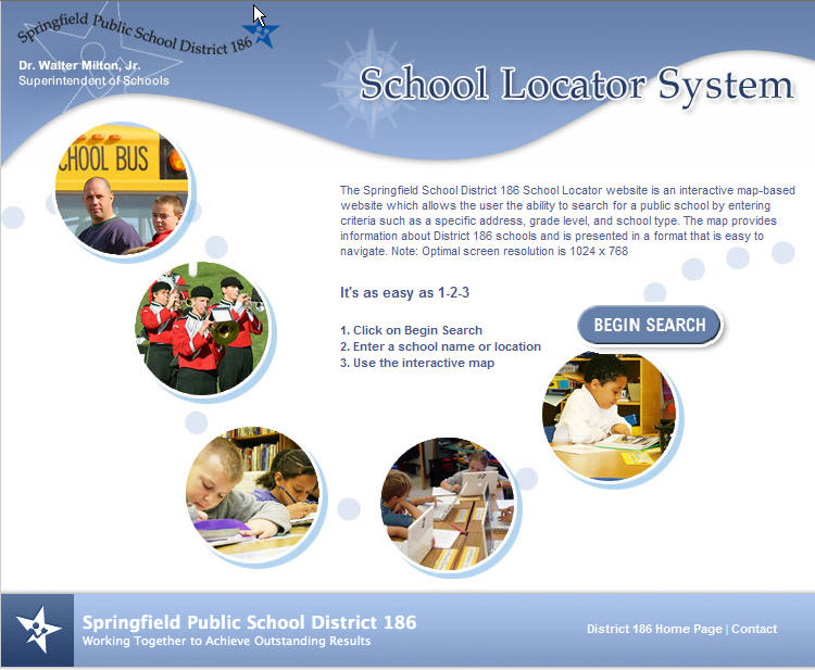 For years, the Springfield, Illinois, Public School District 186 Transportation Department has been using paper maps to maintain the elementary, middle, and high school boundaries. If a boundary changed, all the maps would have to be redrawn by hand and sent out to all the schools. With new streets being built and subdivisions developed, it was a constant and time-consuming process to keep the maps current. In addition, the Transportation Department handled numerous calls daily requesting boundary information. Once a call was received, Transportation Department staff would have to manually look up the address, then reference directories, map books, and several different maps to determine the boundary information. In fall 2006, following a recommendation by the Sangamon County GIS Department, District 186 sought the services of GIS Solutions, Inc., an Esri Business Partner in Springfield, Illinois, for the implementation of GIS technology into the agency's map production procedures. In addition, District 186 wanted to develop an application for the public where users could enter an address and return relevant school boundary information. The school district acquired a license for ArcView and ArcIMS, and GIS Solutions created the school boundary layers for the district's desktop project and the ArcIMS application. The boundaries were created using NAVTEQ street data and a parcel layer, and the school district launched its custom ArcIMS School Locator application, which allows users to identify the correct school(s) based on the address of the student (gis.springfield.k12.il.us/locator/index.jsp).