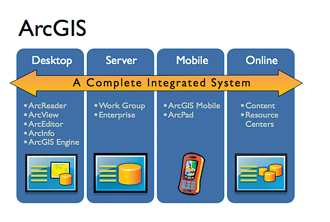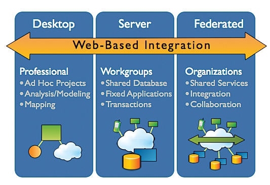 At Esri, our strategy is to build a complete and integrated GIS software platform (ArcGIS software platform). While our vision for this technology is primarily focused on providing useful tools for specific applications, it is also a platform for realizing the integrative vision of geography as expressed above. ArcGIS consists of a series of four components that are used to implement the various GIS patterns described previously. These components provide building blocks to support full enterprise implementations.