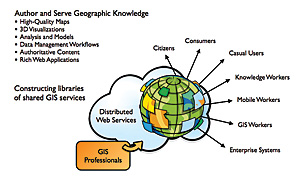 GIS professionals will play an important role in implementing this Web GIS infrastructure by authoring and serving geographic knowledge. High-quality maps and visualization will be part of it, but only the beginning. Analytics, models, and geoprocessing will be integrated. Authoritative content and powerful Web applications will be delivered. GIS professionals will construct large libraries of services and support these services with a distributed architecture and infrastructure that many will access, including citizens and consumers, knowledge workers, mobile users, and other GIS users inside and outside an organization. Also, the services of Web GIS will increasingly be integrated into enterprise IT systems.