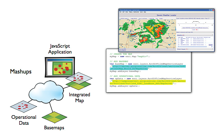 MashupsAt 9.3, Esri released a new REST API that supports JavaScript mashups. This means developers are able to easily combine various types of Web services using simple scripting. This process can combine multiple map overlays in lightweight applications that are easily created by anyone.