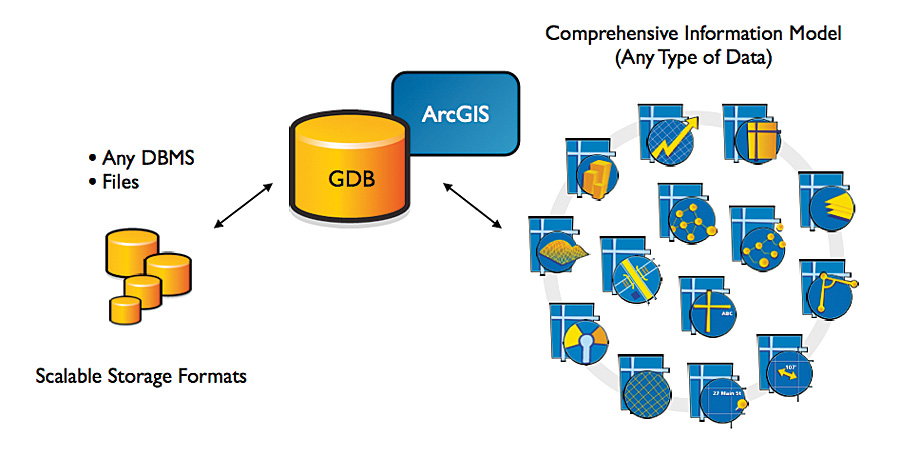 - The GeodatabaseWhile not new, it is important to stress that the foundation for ArcGIS is the geodatabase (GDB). The geodatabase is an information model and physical container for organizing and managing geospatial data. The geodatabase environment is simple, highly preformatted, and scalable. Geodatabase models support virtually any type of geographic data, including image and raster data, vector features and their attributes, terrains, addresses, 3D objects, surveys, and maps. The storage environment of the geodatabase can be in files or in a DBMS.