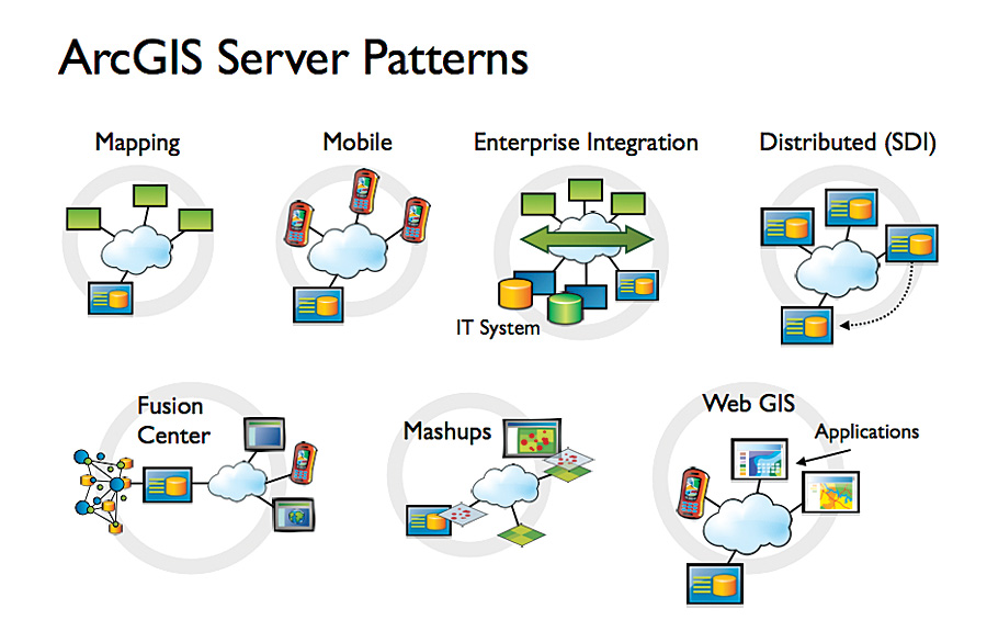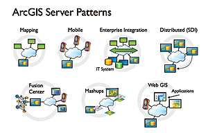 ArcGIS Server is Esri's strategic product for Web and enterprise GIS. At 9.3, we have made enormous progress in providing an open, scalable system that serves geographic knowledge to virtually any client. We have also made the server environment simple. ArcGIS Server is being implemented in a series of patterns within the user community. These patterns include using ArcGIS Server as a mapping server, to support mobile applications, to align geoservices and business systems in an enterprise, as part of the spatial data infrastructure where multiple departments replicate data into an enterprise warehouse, as a fusion center, and to support mashups. All these patterns represent various ArcGIS Server implementations, and while useful to distinguish separately, they can also be thought of as integrated capabilities of a Web GIS.